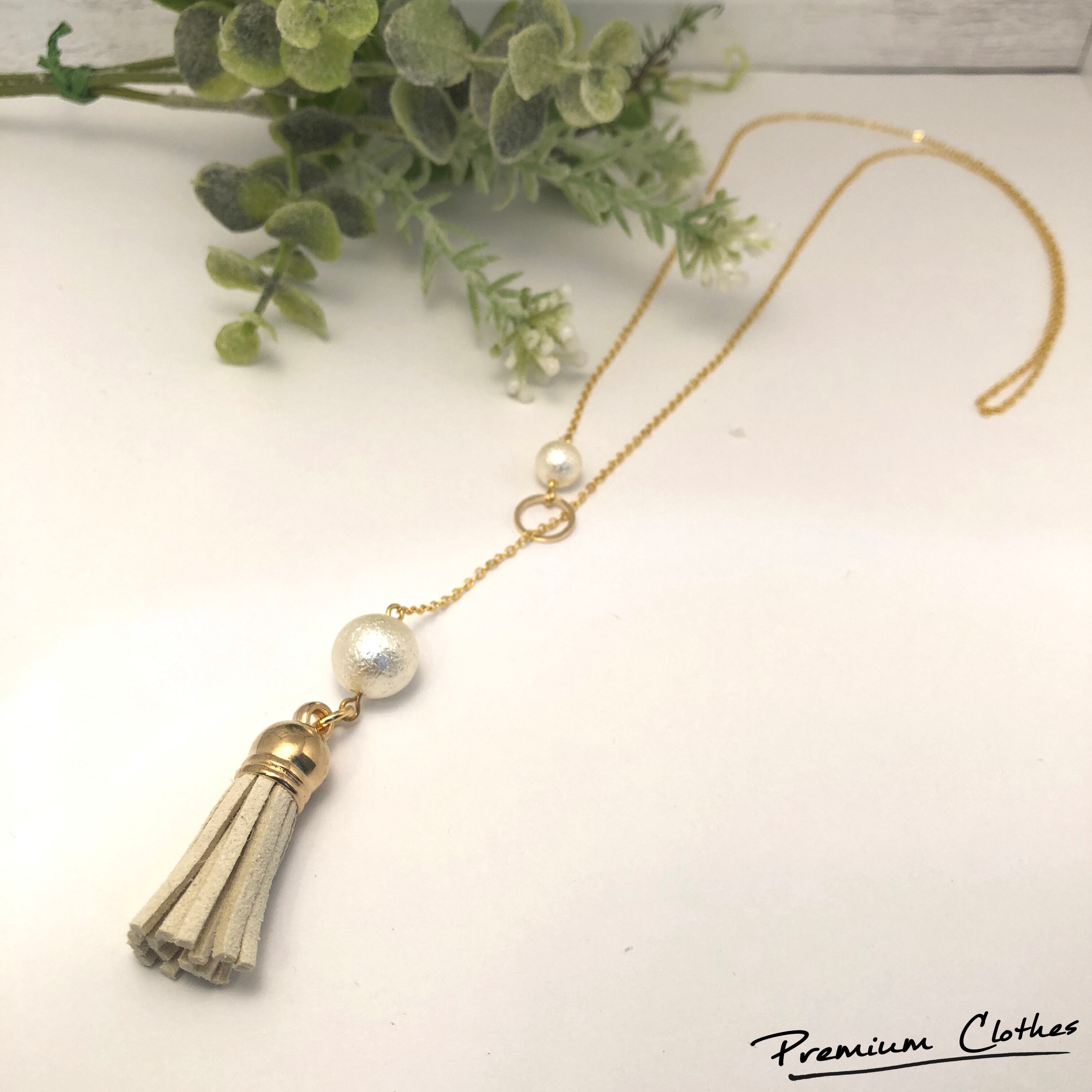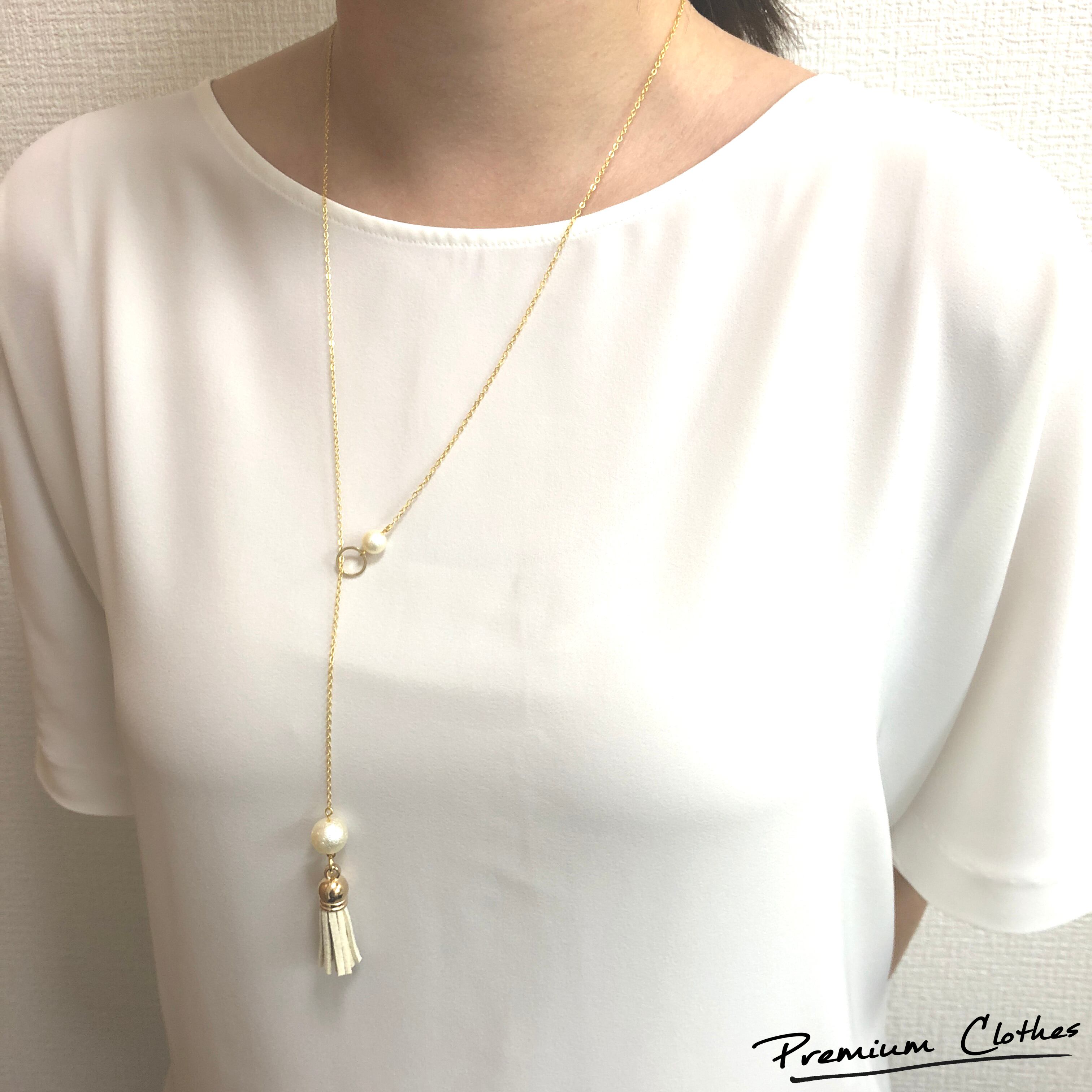 コットンパールと白のタッセルを使ったシンプルなY字ネックレスです。